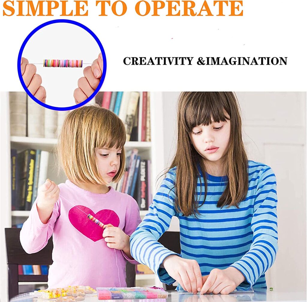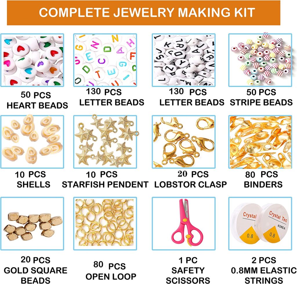 - [ All You Need Included ] This jewelry making kit is enough to make 80-100 bracelet or jewelry , the bracelet making kit includes 2 boxes 8000pcs+ 48 colors polymer clay beads, 52pcs black alphabet beads, 52pcs colorful alphabet beads, 50pcs colored beads, 50pcs striped beads, 80pcs open loop, 80pcs binder, 20pcs lobster clasp, 12pcs gold square beads, 10 shells, 10 starfish pendants, 10 pcs alloy pendants ,10pcs acrylic pendants,1 safety scissors,2 rolls of 0.8mm elastic strings.