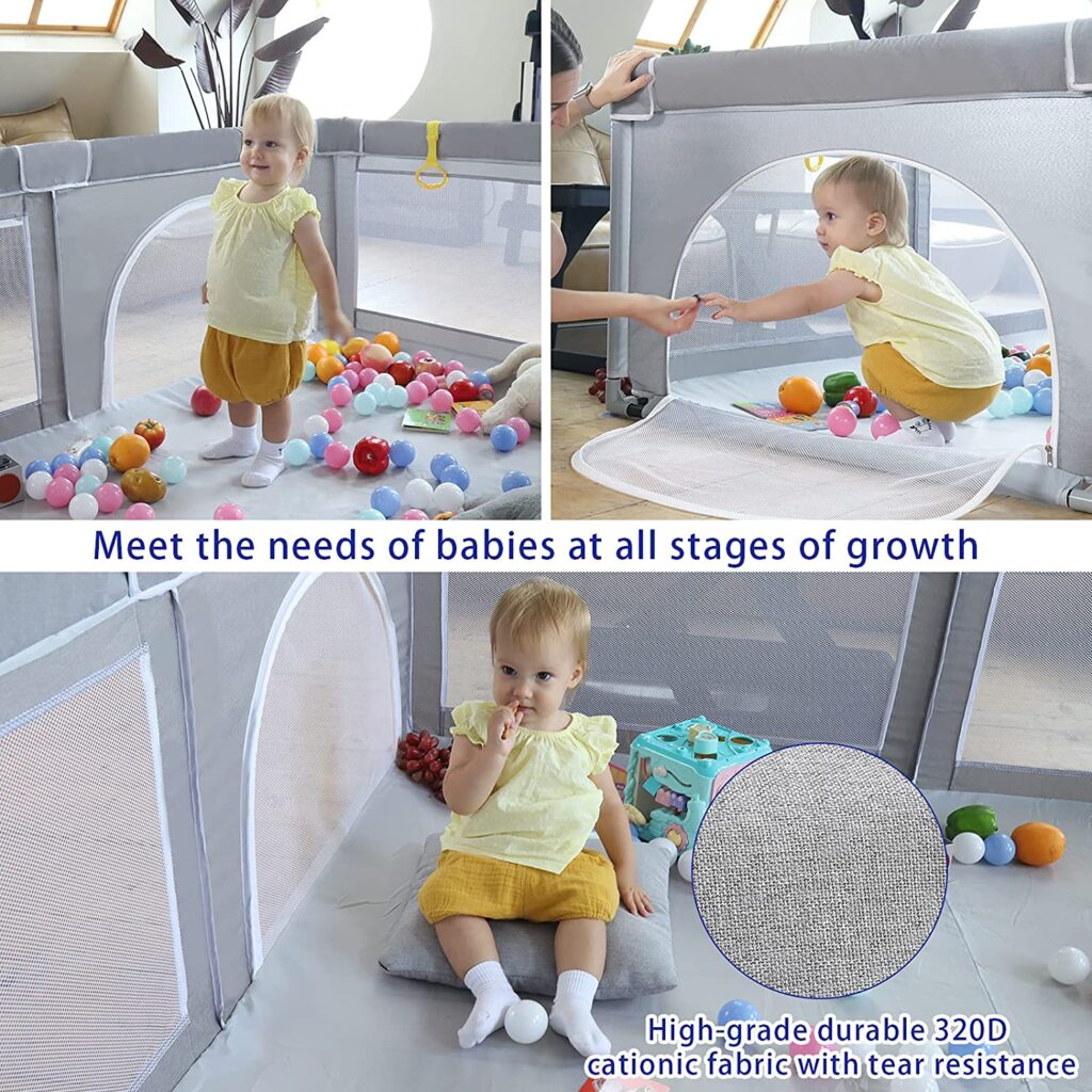 • BREATHABLE MESH & ZIPPER DESIGN: Baby playpen with gate’s sides panels are a visible soft breathable mesh, Interact at any time to give your baby a sense of security.The unique design of the external zipper door not only facilitates parent-child interaction but also ensures that the baby will not escape without authorization!