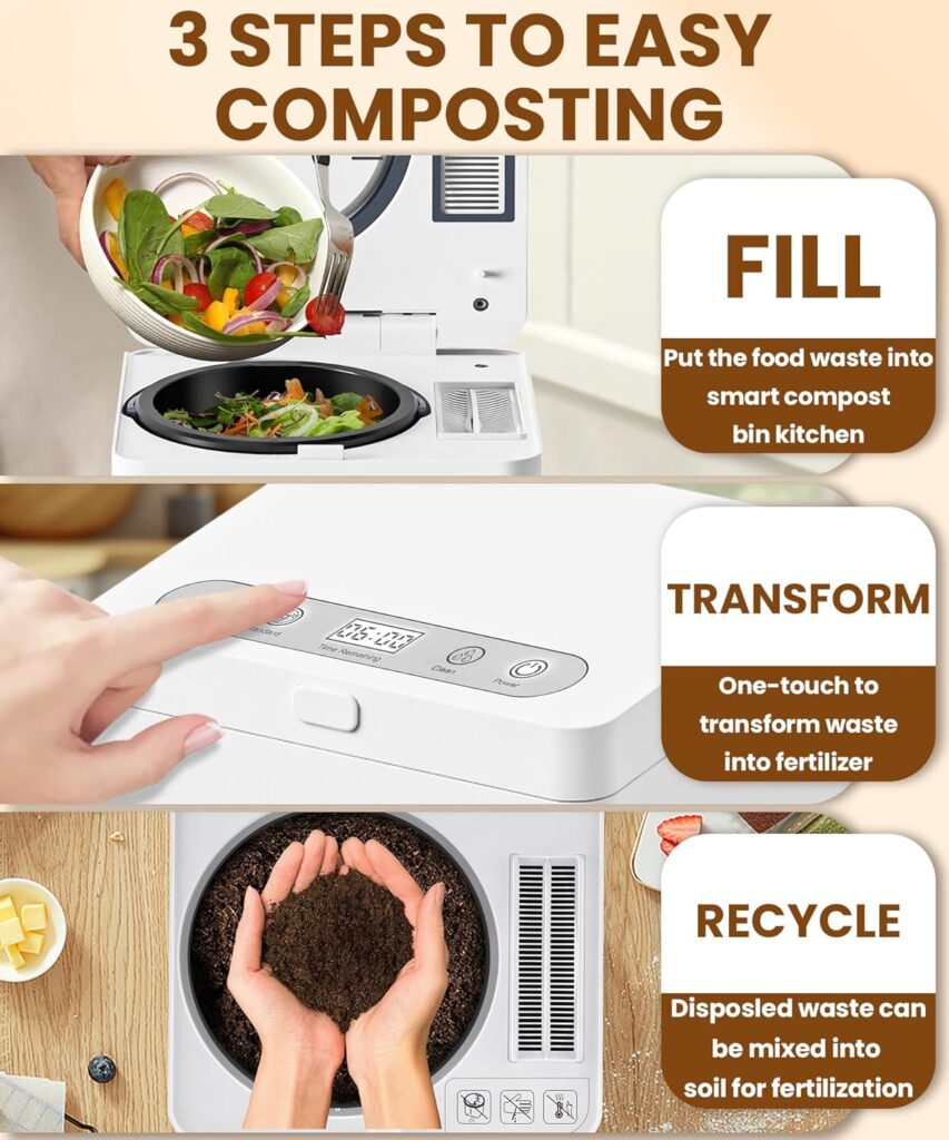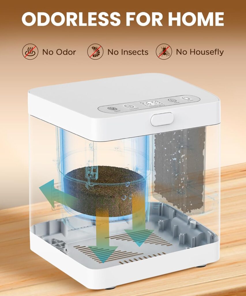 • One-touch composting: The composter allows you to quickly start the composting process with the push of a button. You can choose between standard mode and fast mode and harvest dry compost after 4-6 hours.