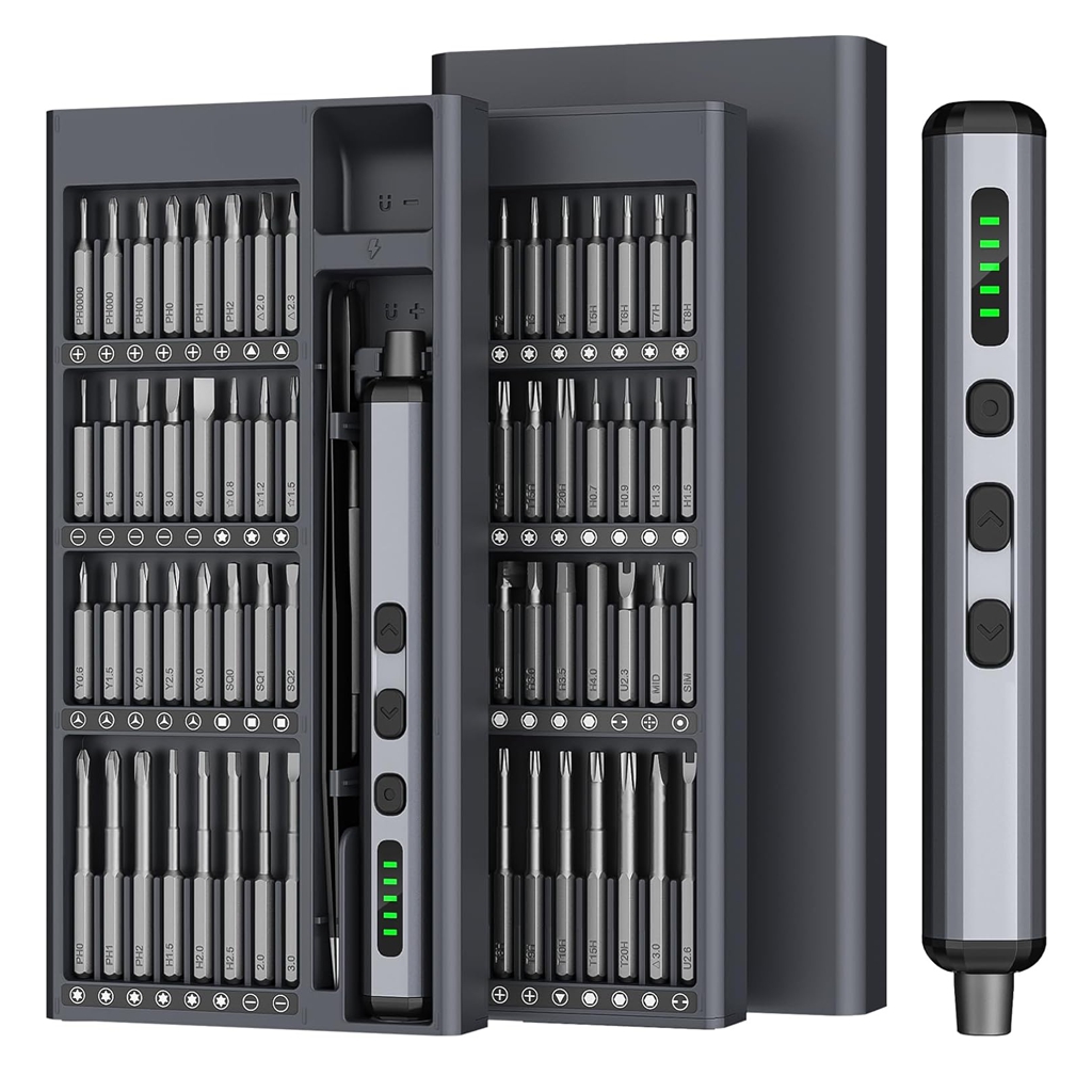 【72-in-1 Metal Screwdriver】Mini electric screwdriver has 64 screwdriver bits and accessories such as tweezers totaling 72 pieces; ready for you to complete a variety of repair tasks.CRV high-strength steel ensures a long and safe service life. High-quality tools make for high-quality work.