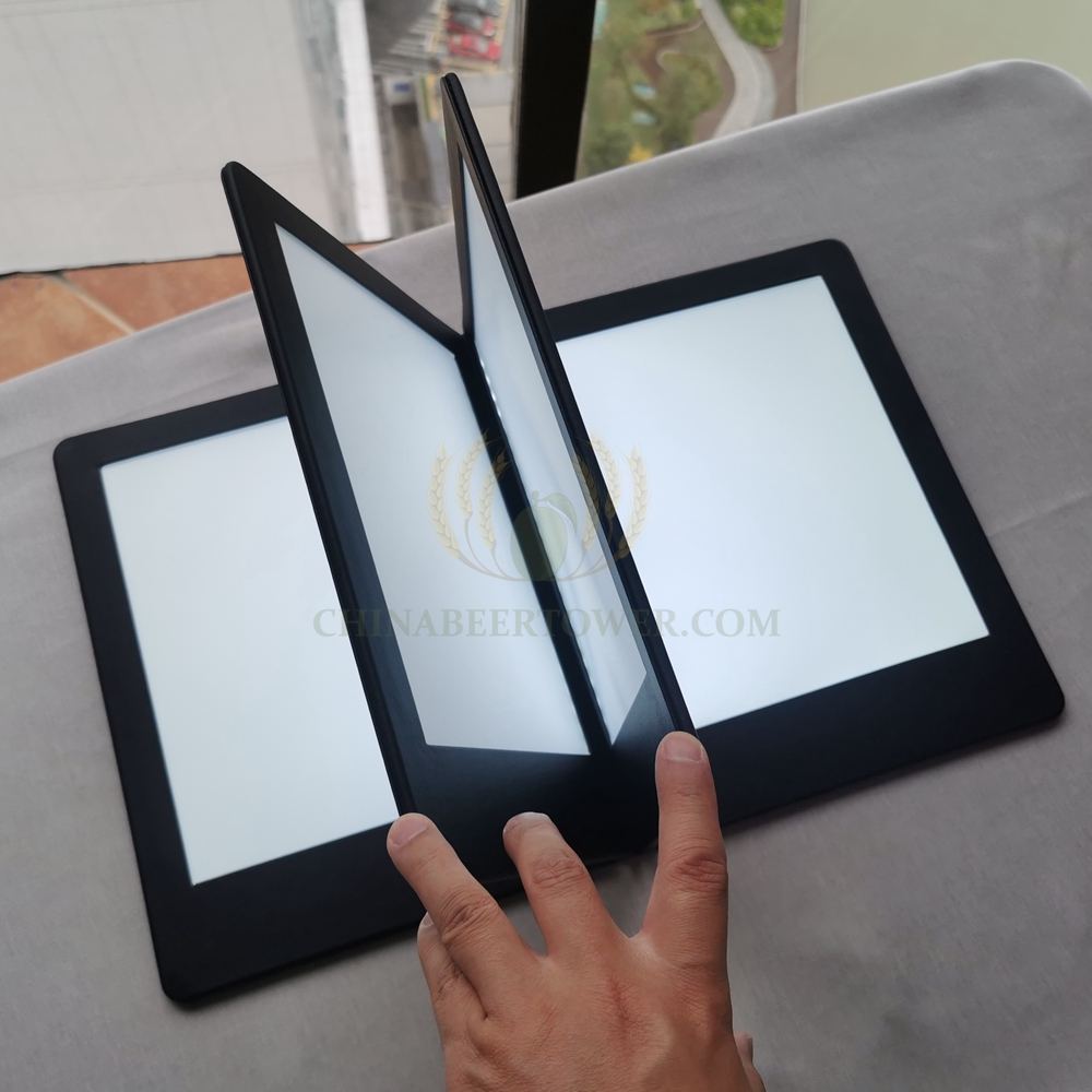 [LED Backlit Menu Cover]: A4 Folded Menu Holder features LED display for allowing customers to read menu listings in lowly lit settings, only lit up when opened to a certain point, and remains off when closed or extended past 180 degree
